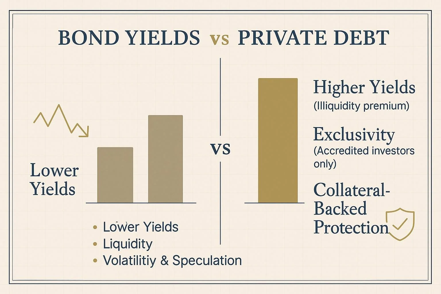 Private debt investing offers accredited investors distinct advantages over bonds or treasuries. Yields are generally higher due to the illiquidity premium. Access is exclusive, reserved for accredited investors who can participate in carefully underwritten deals. And while traditional bonds may offer liquidity, private debt provides risk-adjusted protections with collateral-backed structures.