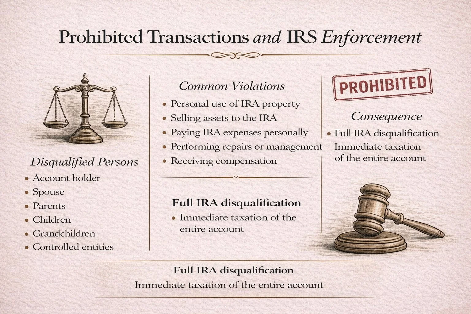 What is the biggest compliance risk with SDIRA real estate? The greatest risk is engaging in a prohibited transaction. This includes personal use of IRA-owned property, self-dealing with disqualified persons, or performing services on the property yourself. Violations can disqualify the entire IRA.